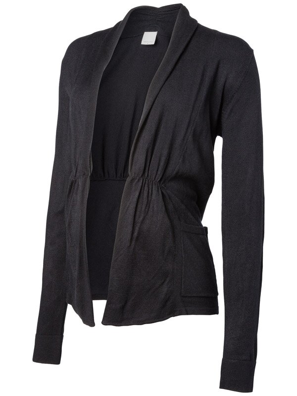 Finstickad cardigan för gravida i riktigt mjuk och skön kvalitet. Perfekt basplagg i mammagarderoben som fungerar lika bra till vardag som till fest. Fickor fram och rynk ovanför magen.