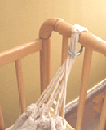 Två karbinhakar som kan sättas i öglan på babyhängmattan och därefter användas för upphängning i t ex en spjälsäng.