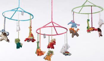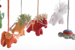 Underbart söt mobil med virkade djur. Finns med tre olika färger på banden; blå, rosa eller grönt. Mobilen tillhör serien Peppa och är handgjorda i Fair Trade i Indien.