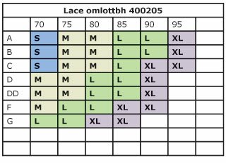 I tabellen nedan välj ditt mått under bysten i den övre raden och kupstorleken i vänsterkolumnen. Följ raderna tills de möts och läs där av vilken storlek du ska beställa.