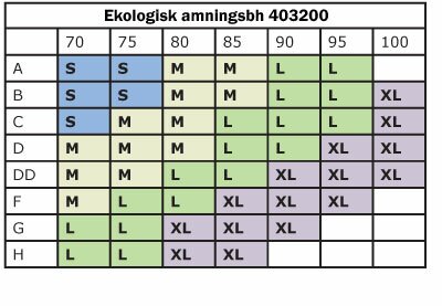 I tabellen nedan välj ditt mått under bysten i den övre raden och kupstorleken i vänsterkolumnen. Följ raderna tills de möts och läs där av vilken storlek du ska beställa.