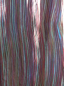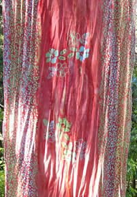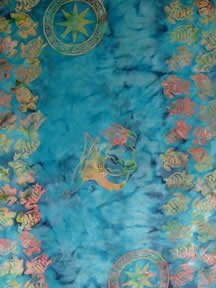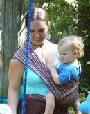 Hand-batiked gauze wrap from Gypsy Mama. Light and cool, perfect for the summer. Bali Baby Breeze has a pocket at the end of the carrier that stores the wrap in a tidy bundle when not in use and makes it very hand to carry with you. The wrap also has a label marking the center of the wrap.